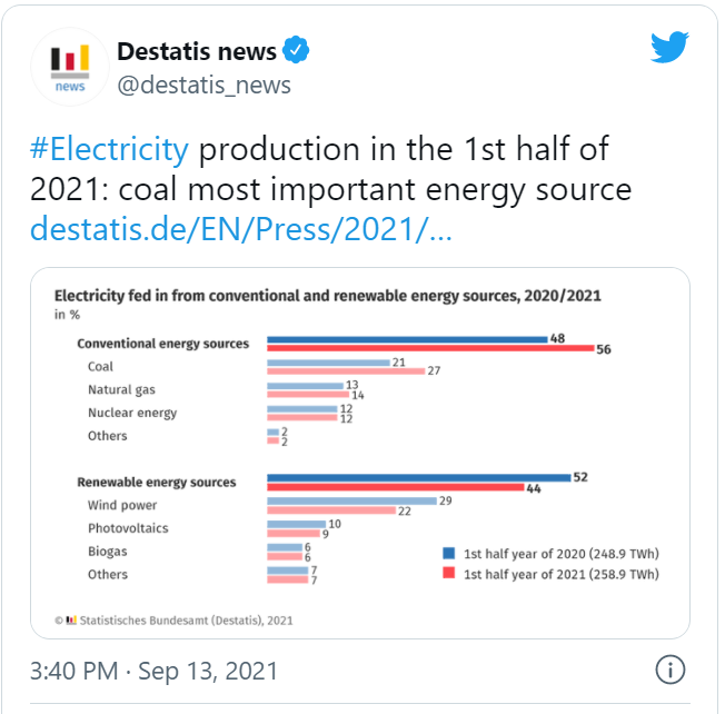 In total, conventional energy sources — including coal, natural gas and nuclear energy — comprised 56% of the total electricity fed into Germany’s grid in the first half of 2021.