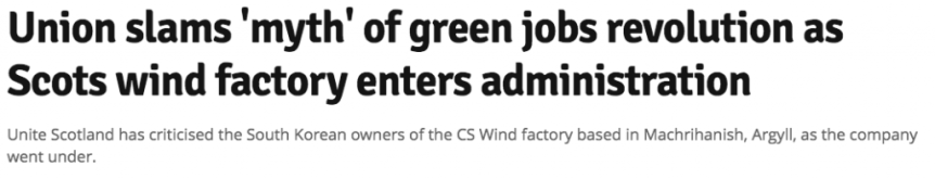 A trade union has slammed the “myth” of a green jobs revolution after Scotland’s only wind factory has closed permanently. The UK’s ambition to become the Saudi Arabia of renewables with promises of a wind farm jobs bonanza are evaporating as Britain is at risk of turning into the Venezuela of renewables.