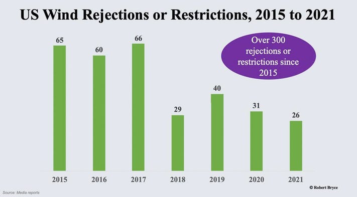 Applying pressure to local governments and authorities – and litigating like their lives and livelihoods depend upon it – rural Americans are getting their local governments onside and against the wind industry, with hundreds of projects rejected by local governments since 2015.