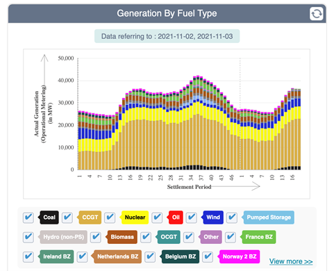 Figure 1: Generation by Fuel Type on the GB Transmission System for 2 November 2021 to 3 November, by half hour settle period.