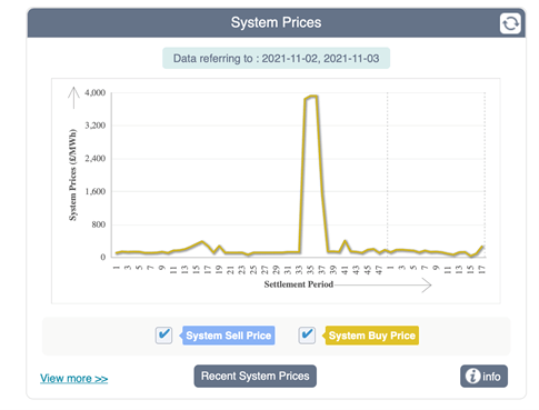 Figure 2: System Prices on the GB Transmission System for 2 November 2021 to 3 November, by half hour settlement period.