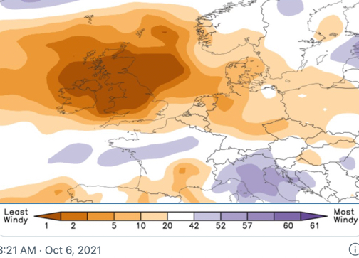 This map from EnergyPostEU courtesy of World Climate Service, shows how little wind there was in parts of Europe during the summer of 2021.