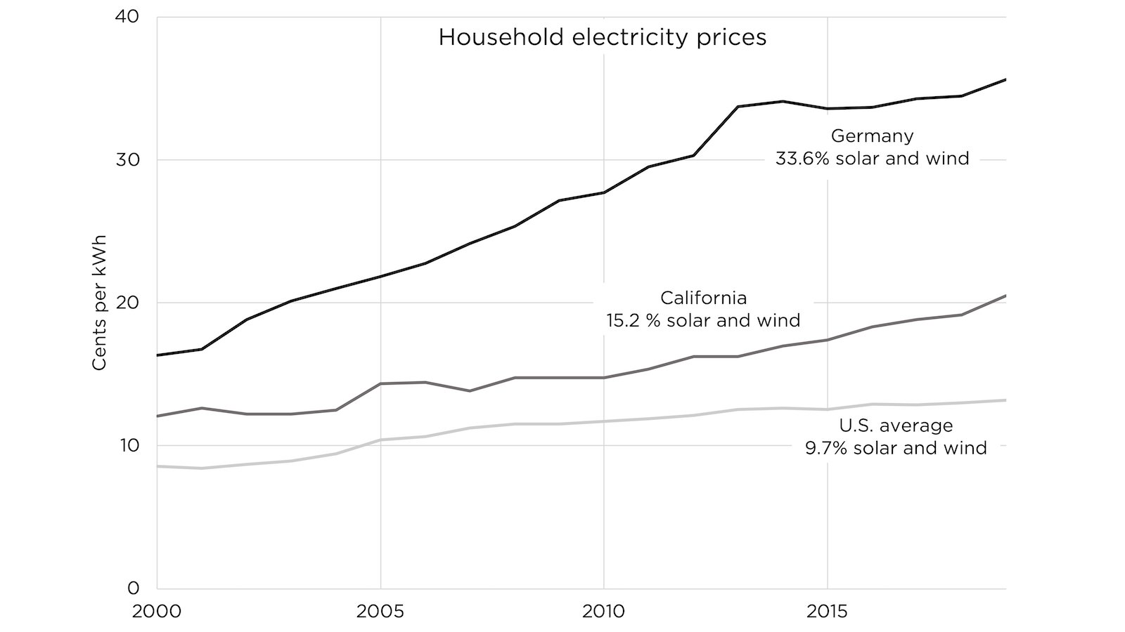 German household electricity prices have more than doubled to over 0.3€ per kWh ($0.35 per kWh depending on currency exchange rate) since 2000 when the modern renewable energy law started to massively incentivize solar and wind capacity on the German grid.