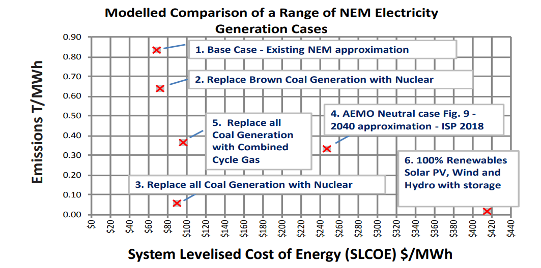 The models include additional transmission costs for various options including replacing brown coal with nuclear energy, replacing coal with gas and 100% RE with hydro and storage.