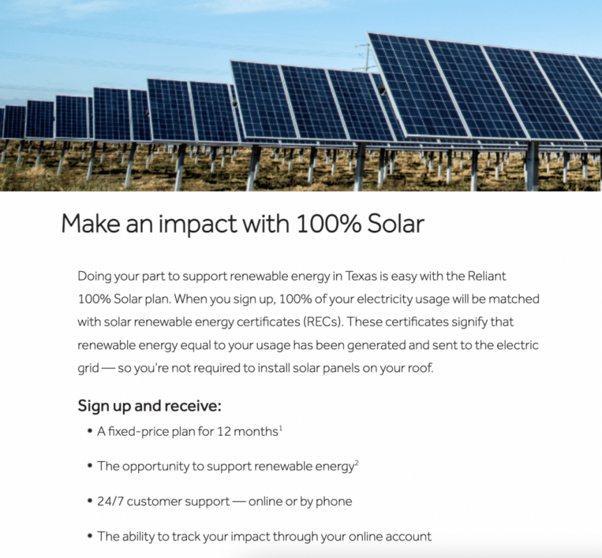 Let’s take a closer look at the phrasing, “100% of your electricity usage will be matched with solar renewable energy certificates (RECs).” More effort is needed to enhance the transparency of where this energy is actually coming from. Reliant is a fantastic example of a company that finds legal avenues to market itself as a supporter of 100% renewable energy without having to make significant changes to the way it sources its electricity.