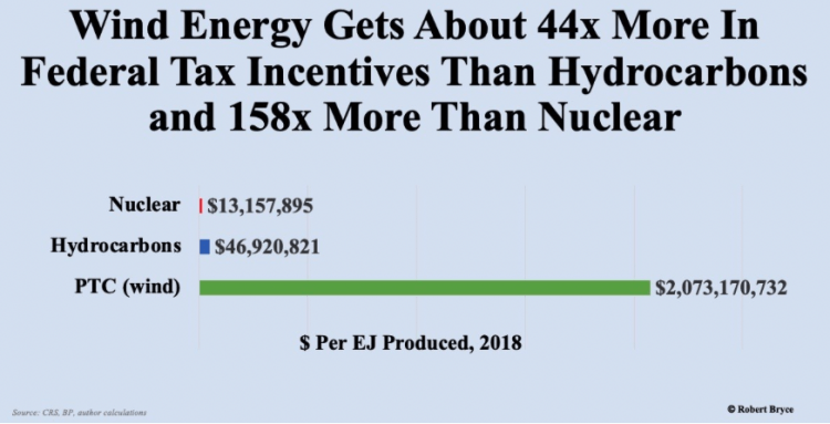The wind industry doesn’t need more of our federal tax dollars. Instead, it should be forced to stand on its own. As I show in the graphic above, which is based on Congressional Research Service data from 2018, when measured by the amount of energy produced, the wind industry gets about 158 times more in tax credits than the nuclear industry and about 44 times more than the hydrocarbon sector.