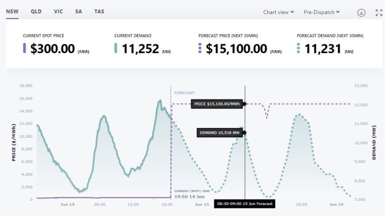 Here the forecast price for the whole of NSW is a blistering $15,100/MWh for nearly every single minute of the next 24 hours, but the actual price is coming in at the mandated $300.00. The Queensland graph looks almost exactly the same. There has not been a day like this…