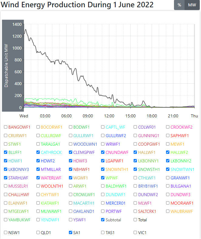 Because, if they were able to make the wind blow on demand, they would be able to avoid situations like that depicted above – being the output from SA’s fleet of whirling wonders (with a nameplate capacity of 2,142 MW) on 1 June 2022.