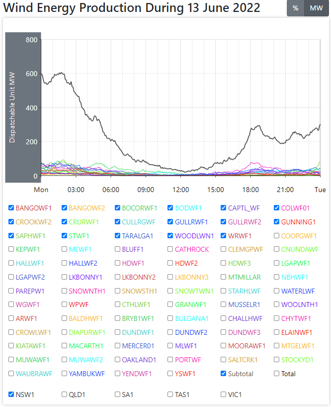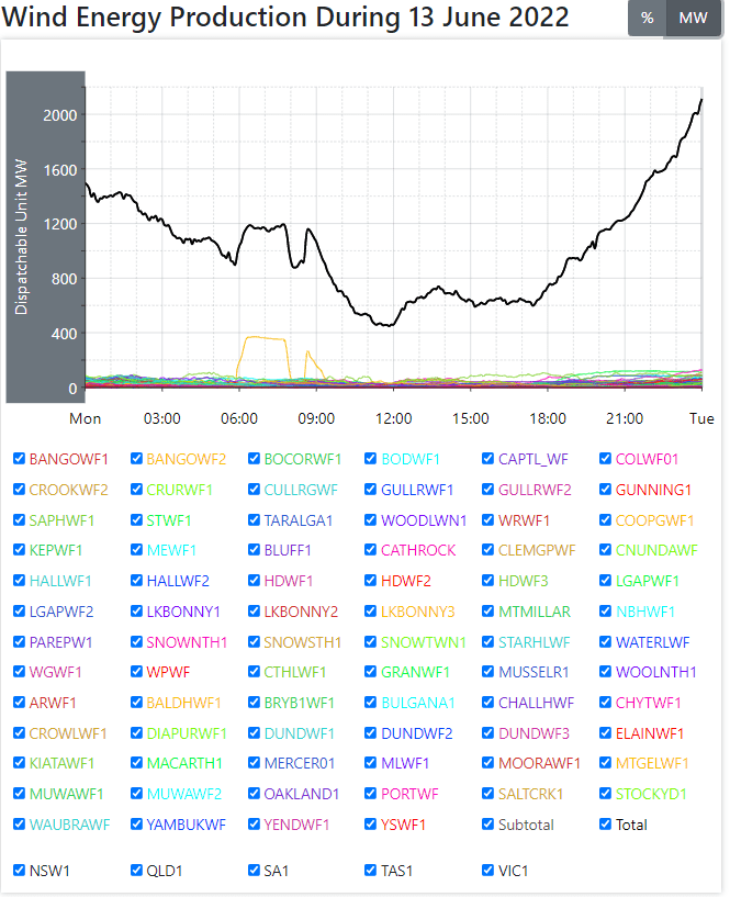 Set out above – courtesy of Aneroid Energy – is the output from all of the whirling wonders that grace the ranges of NSW on 13 June 2022, with a notional capacity of 2,224 MW.