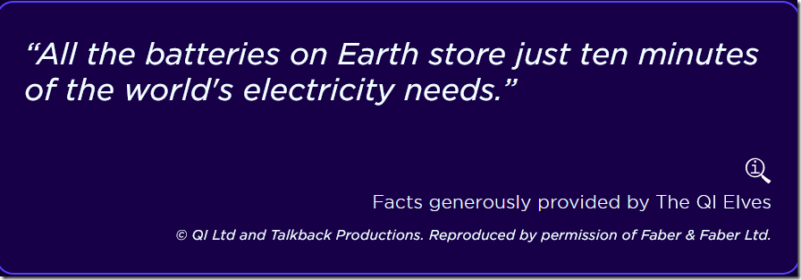 The combined capacity of all of the batteries on Earth would store a trivial 10 minute’s worth of the World’s electricity needs.
