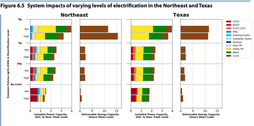 Many of the charts and graphs are very complicated and technical, but if you spend some time with them, you start to realize that they are an insult to your intelligence. I’ll give you just one of my favorites, this one from page 191. Here we are considering what the electricity generation system will look like for two regions, the Northeast (New York and New England) and Texas, in various low and no-carbon scenarios. The cutoffs of 0g, 5g, 10g and No Limit at the left refer to how much carbon emissions are allowed per kWh of electricity generated.