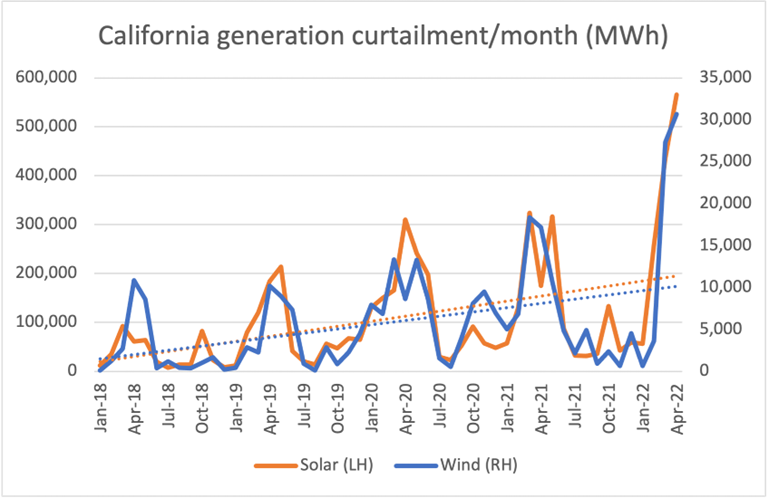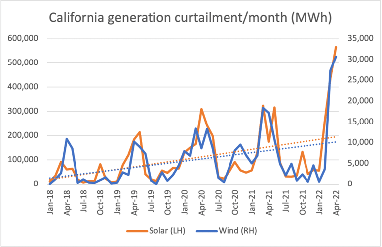 As renewable generation increasingly exceeds total demand, the network system operator has to curtail (i.e. turn down) intermittent output more. It started long before intermittents hit 100%, even momentarily, because the system needs some thermal generation for system services, and some non-renewable technologies, like nuclear, can’t easily be turned off. California has been curtailing wind and solar long before 8 May. But the amount of curtailment that is required is increasing rapidly (charts below based on data from the California Independent System Operator).