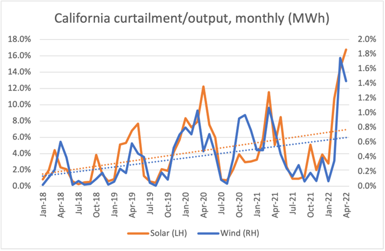 Renewable output is increasing, so you might expect the curtailed output to increase with it, even if there were no increase in the rate of curtailment.