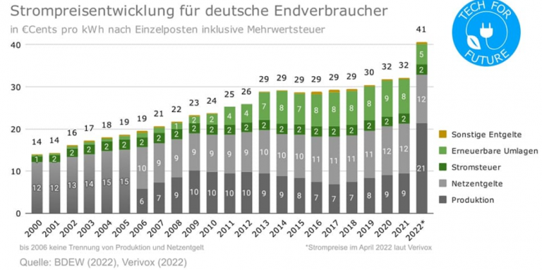At Facebook, Helmut Bauer posted the most recent chart depicting Germany’s electricity rates for end-consumers. It’s a blood bath: