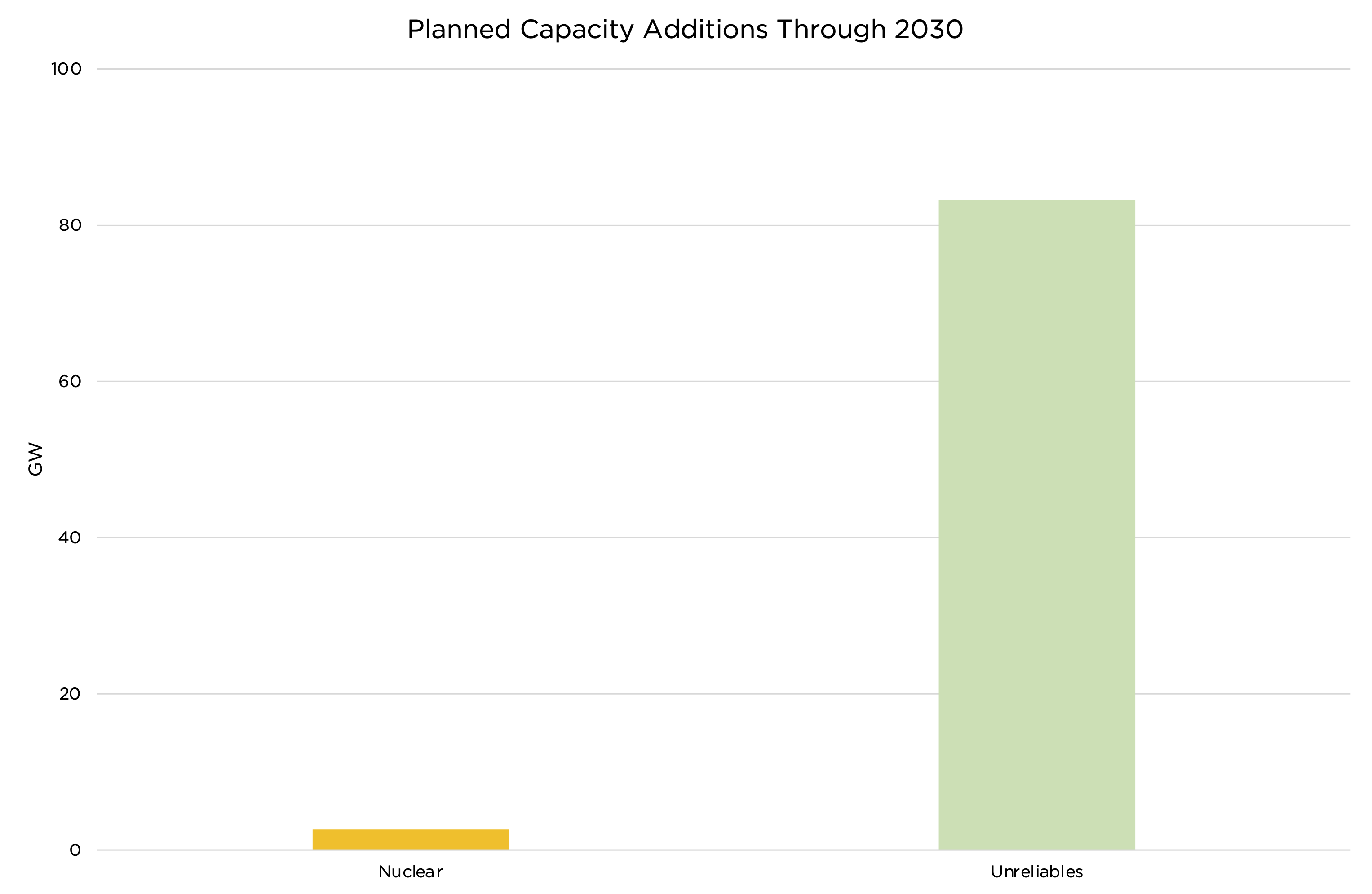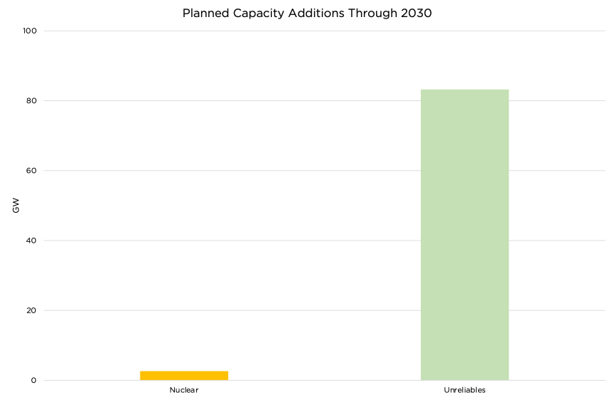 • Will our rapid shutdown of coal plants that make up ⅕ of our reliable capacity be offset by new nuclear plants? Not remotely. Here are the minuscule plans for nuclear compared to the plans for unreliable solar/wind through 2030. [11]
