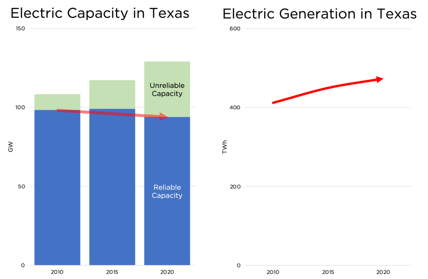 • Since at any given time solar and wind can go near zero, using them as replacements for reliable power plants doesn’t work. For example, Texas’s February 2021 disaster was caused by solar/wind disappearing and inadequate investment in reliable power plants and their weatherization. [2]