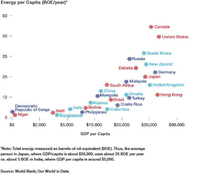 Historically, the energy costs of manufacturing a product roughly tracked the weight of the thing produced. A refrigerator weighs about 200 times more than a hair dryer and takes nearly 100 times more energy to fabricate. But it takes nearly as much energy to make one smartphone as it does one refrigerator, even though the latter weighs 1,000 times more.[21] The world produces nearly 10 times more smartphones a year than refrigerators. Thus, the global fabrication of smartphones now uses 15% as much energy as does the entire automotive industry, even though a car weighs 10,000 times more than a smartphone.[22] The global Cloud, society’s newest and biggest infrastructure, uses twice as much electricity as the entire nation of Japan.[23] And then, of course, there are all the other common, vital needs for energy, from heating and cooling homes to producing food and delivering freight.