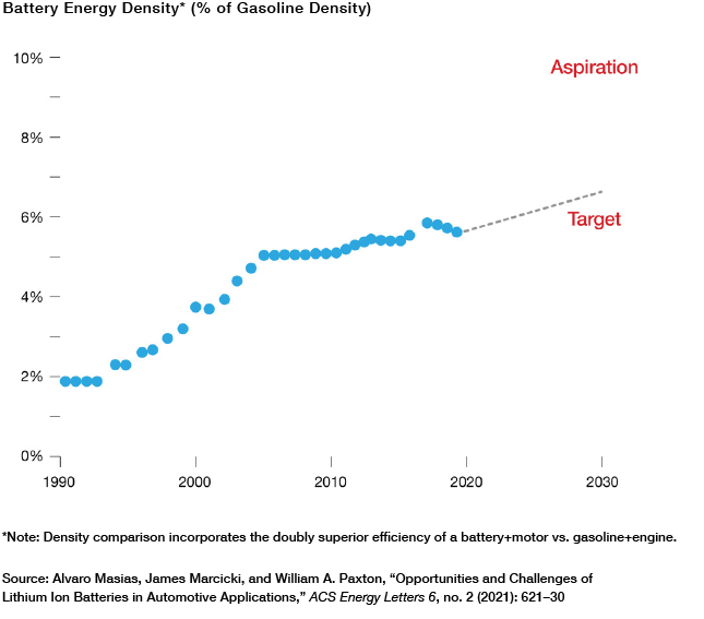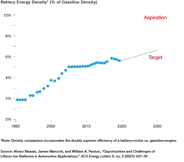 The lithium battery is what made it possible to build useful EVs. Even so, today it still costs at least 50%–70% more to buy an EV instead of a comparable standard car. Purchase price aside, conventional wisdom has it that consumer reluctance to embrace EVs also arises from so-called range anxiety, which, it is argued, is solved with lots of charging stations. Yet most EVs already have a range equivalent to gasoline-powered cars, 200–400 miles. The issue isn’t range; it’s the time it takes to refuel a battery.