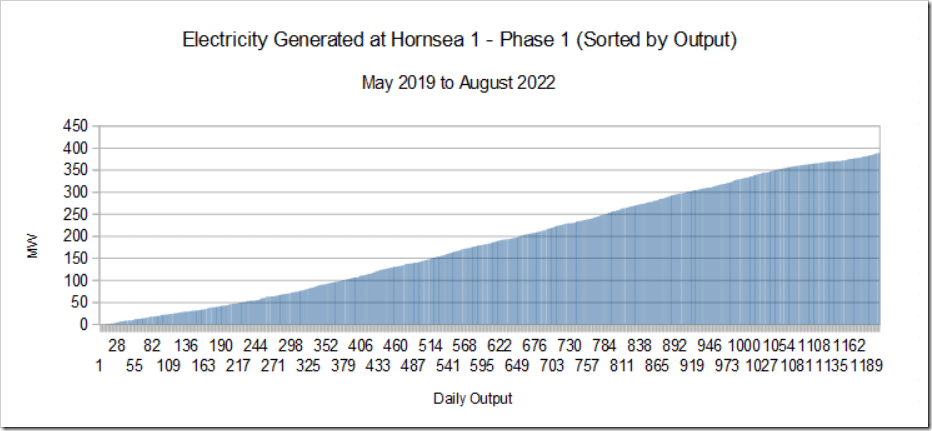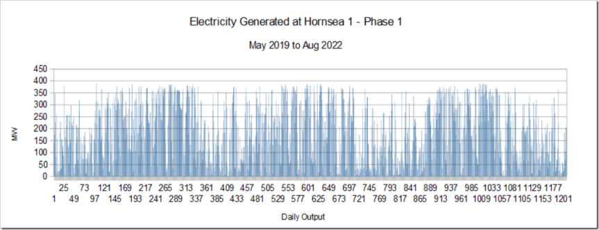Hornsea 1 – Phase 1 is rated at 400MW, and output has varied anywhere from 1 MW and 390 MW since 2019.