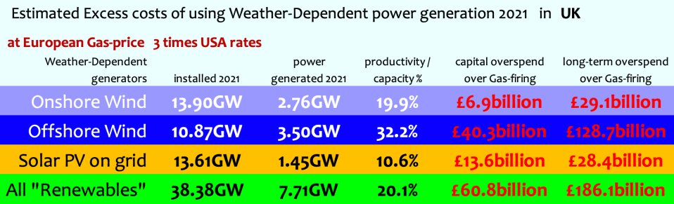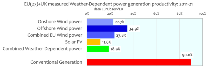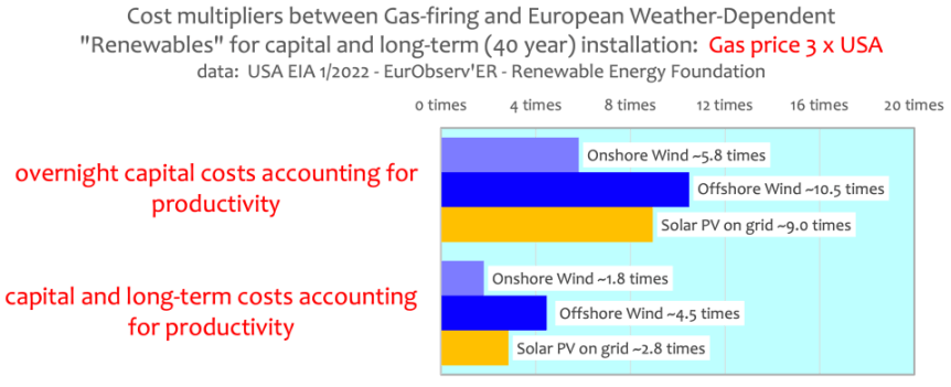 The US EIA, Energy Information Administration, produces comparative capital and long-term costs for power generation technologies. When their Weather-Dependent “Renewables” costs are merged with the recorded European productivity for generating the same unit of power over the year and compared to the cheapest power generation technology Gas-firing at USA prices the comparative value for money is stark.