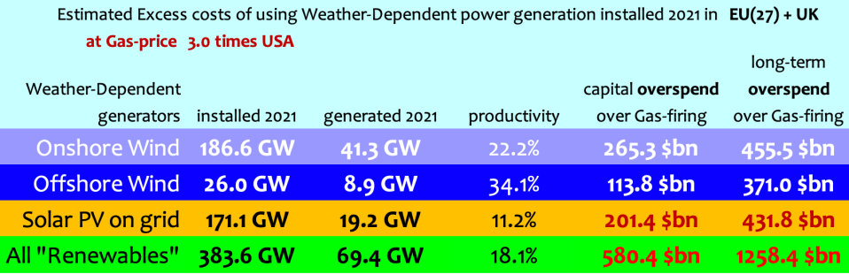These simple calculations show that any claim that Wind and Solar power are now cost-competitive with conventional fossil fuel (Gas-fired) generation are patently false. The figures give an outline of the financial achievements of Green activists in stopping fracking for gas in Europe, close on to $1.2 trillion of excess costs.