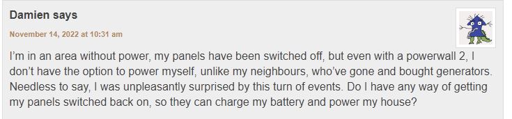 This has left some solar power owners feeling somewhat vexed and perplexed and downright deflated — they’re sitting in the dark, and with a Tesla powerwall, yet they can’t use their solar panels at all and their neighbors have the lights on with diesel generators…
