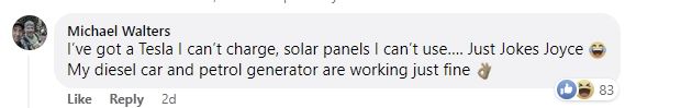 It’s a long thread of comments on Facebook… (for anyone with a Tesla battery, apparently you can switch it to “off grid mode” in a blackout.)
