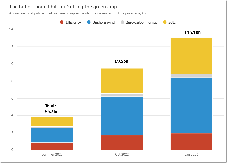 Of the £9.5 bn saving claimed, £7.4 bn is from onshore wind and solar projects, which would supposedly have been built without the cancelling of subsidies. (They fail to explain why they were not built anyway, if they were so “cheap”). I’ll ignore the savings from “efficiency” as the report fails to calculate the cost of fitting insulation etc – they even ludicrously include electric cars in this, conveniently ignoring the fact they cost ten grand more to buy!)