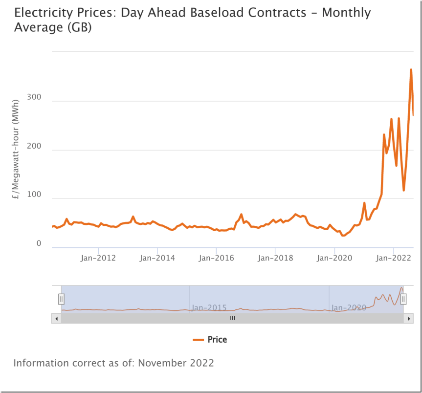 The last wind and solar farms built under the CfD subsidy system are currently priced at £100.31 and £96.33/MWh respectively. There is no evidence that construction costs have come down since they were built. However until energy prices started spiking last year, the wholesale market price for electricity has been around £50/MWh: