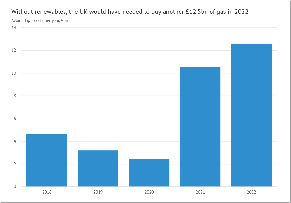 The only correct way to compare costs is to look at avoided marginal costs of gas, which the above chart does. Between 2018 and 2022, they reckon we would have had to buy an additional £33.5 billion worth of gas, if we had not had renewables.