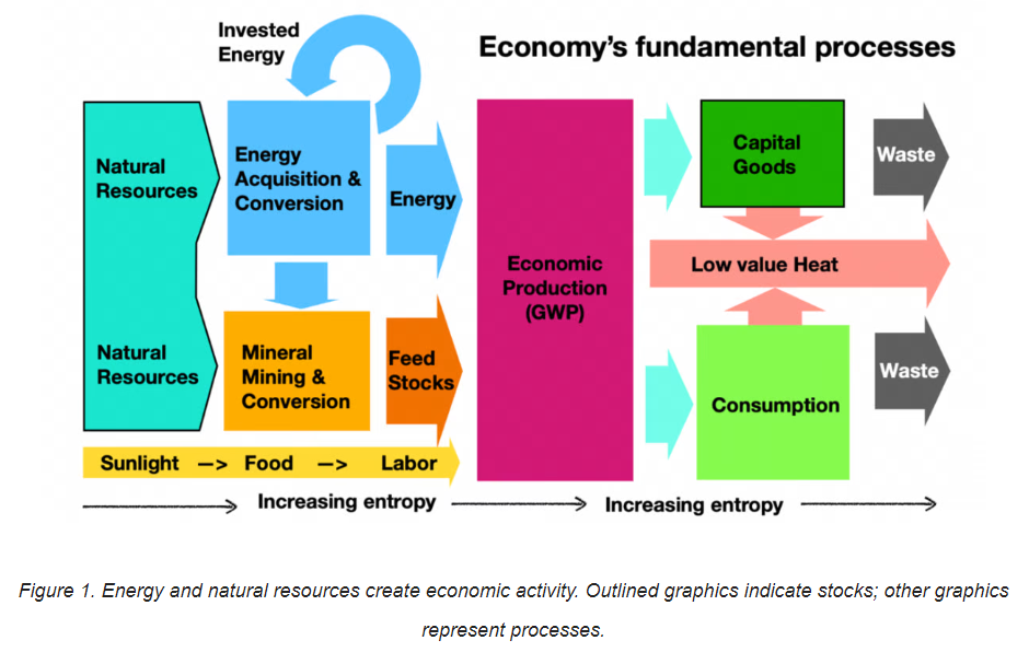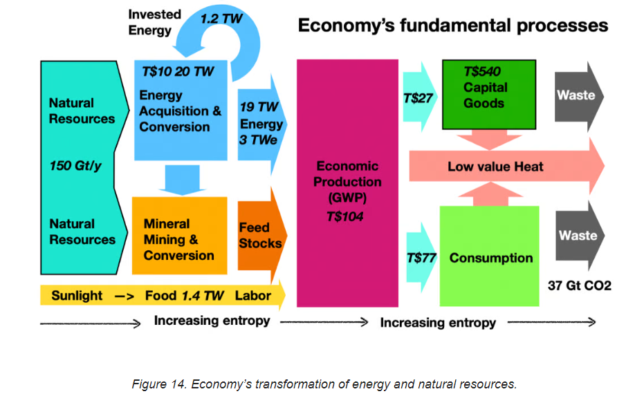 Our world economic system obtains energy and mineral feedstocks from Earth’s natural resources, raising entropy, creating low-value heat and waste. One waste is CO2 that gradually warms the planet, but this is just one concern in a complex system. As concentrated natural resources are mined out, then to obtain more the economy must use more energy and more natural resources in order to deploy more capital goods machinery to obtain them.