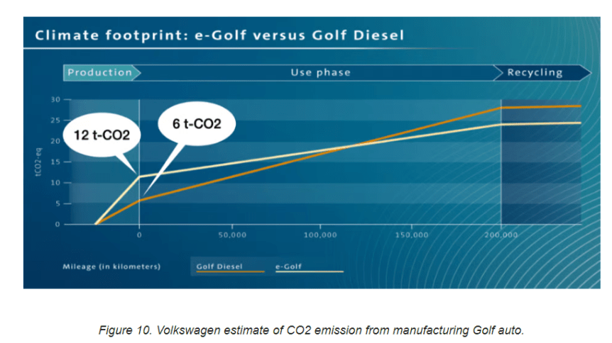 To test this concept consider the cost of a product that is sold in volume in a competitive market — an auto. Least expensive models are priced most competitively. In 2019 Volkswagen estimated the CO2 emissions from producing a VW Golf and VW e-Golf. I trust VW’s reformed, good behavior in the wake of dieselgate. For my Dartmouth Osher course I annotated VW’s graphic to highlight approximately 12,000 kg-CO2 for an e-Golf including its battery and 6,000 kg-CO2 for a diesel powered Golf. Note 1 t = 1 tonne = 1,000 kg.