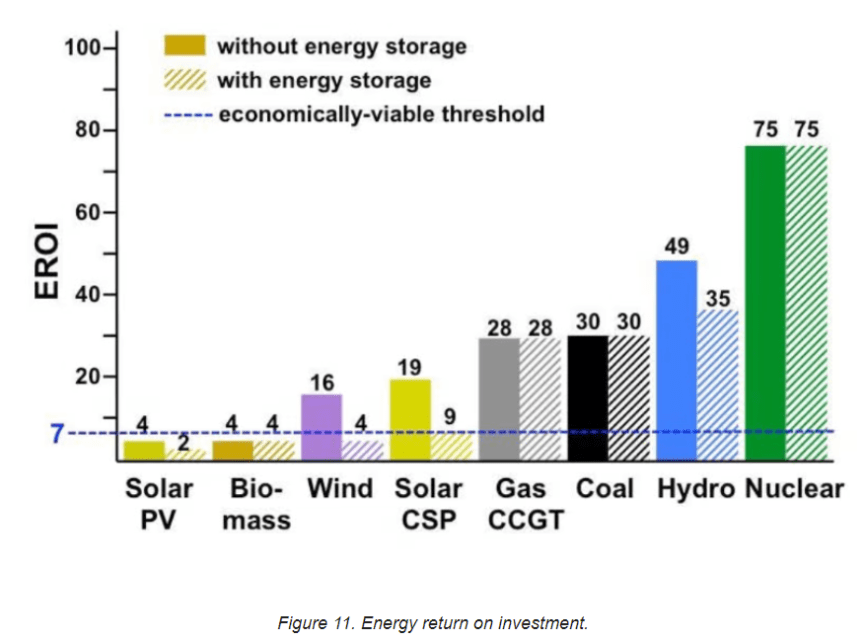 Weissbach analyzed EROI for electricity generation sources. The striped bars indicate lower EROI for variable energy sources that require energy storage. Net EROI less than 1:1 is clearly an energy sink, and an EROI less than 7:1 is uneconomic, requiring subsidies to encourage development. Global average EROI is now 17:1. Neither Wind nor PV Solar generation is sufficiently economic to attract private investment, so subsidies are required. Lowering energy’s EROI from 17:1 to uneconomic levels under 7:1 would collapse the economy. Powering the world with nuclear fission at EROI of 75:1 would reduce invested energy requirements by $8 trillion per year.