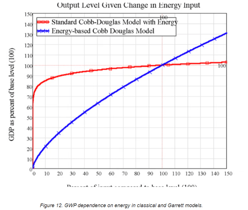 GWP generally increases year after year, so Garrett’s sum depends largely on recent years’ GWPs. We estimated energy’s contribution to GWP at 1 kWh/$ during a year, or 114 mW/$, whereas Garrett found 4.3 mW/$ of historical cumulative production. These two concepts match if capital goods K have an average useful life of 114/4.3 = 27 years, during which they consume energy to produce GWP. A capital goods in service lifetime of 27 years seems reasonable.