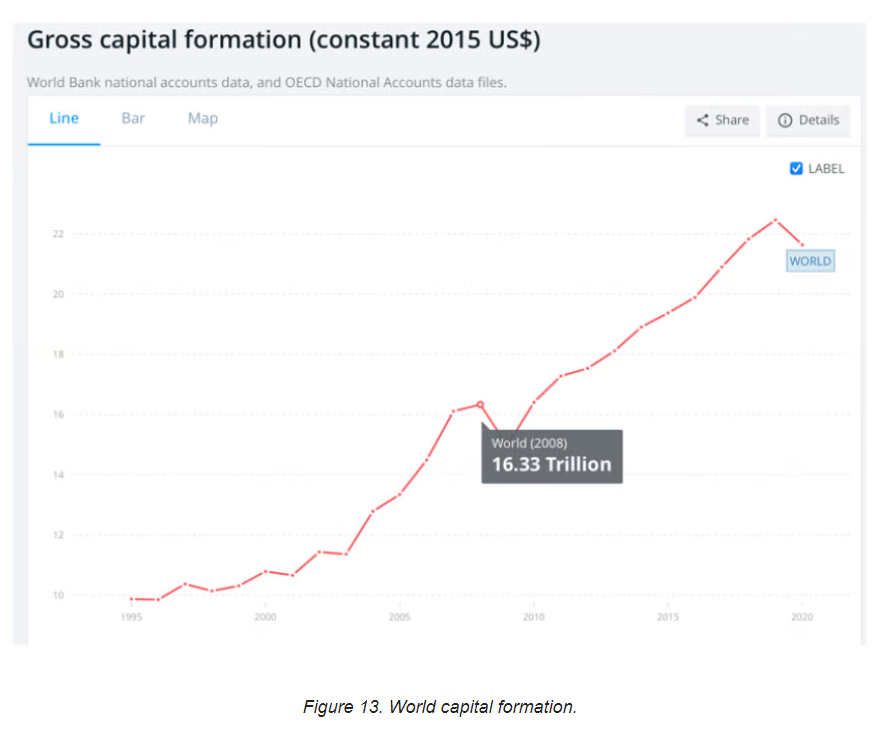 World Bank’s graph in Figure 13 shows that annual capital goods formation over 27 years averages roughly $16 trillion in constant 2015 dollars, or $20 trillion in 2022 US dollars. With a useful lifetime of 27 years, capital goods in service amount to approximately 27 years x $20 trillion/year = $540 trillion.