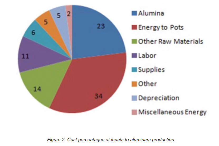 The next biggest cost, 23%, is for the material alumina, aluminum oxide refined from mined bauxite. Alumina is typically transported by ship to the smelter, so there is transportation energy cost in this alumina cost. Alumina is produced using energy to heat bauxite ore in a pressure vessel at 150-200°C in a sodium hydroxide solution. Shipping bauxite ore requires propulsion energy. Bauxite is harvested by energy intensive strip mining. Including these energy expenditures brings aluminum’s embedded energy far over the direct 36% smelter component.
