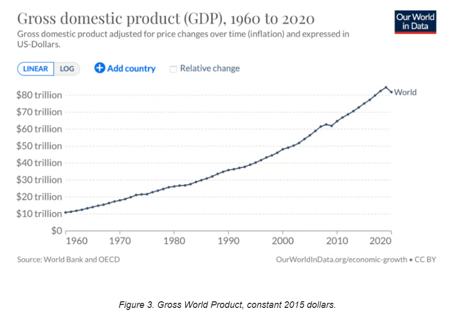 GWP is plotted in Figure 3, though labeled GDP (nation=World). For 2022 GWP sums to $104 trillion.