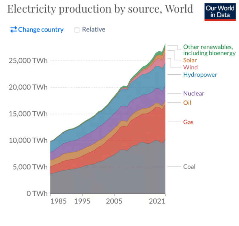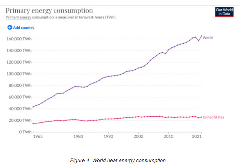 Figure 4 shows global heat energy consumption (excluding food) through 2021 at 176,000 TWh per year, or 176 PWh/year, or 20,000 GW. BP reports 165,000 TWh/year. We’ll assume 176,000 TWh/year for 2022.