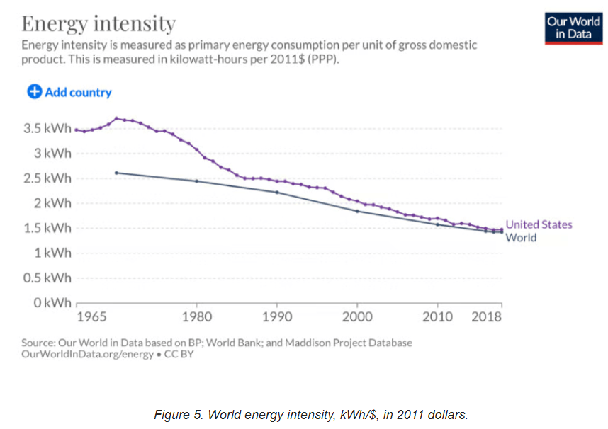 The Figure 4 graph of GWP looks much like the Figure 3 graph of world heat energy consumption. The ratio of GWP to annual energy consumption is termed energy intensity, plotted in Figure 5.