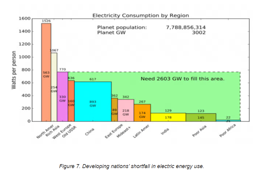 The height of each colored block represents the average electric power consumption per capita. The width is proportional to the regional population, so the area represents regional average electric power generated and used. If citizens of developing countries use as much power as Europeans, electric power demand would increase by 2600 GW, or 23 PWh/year.
