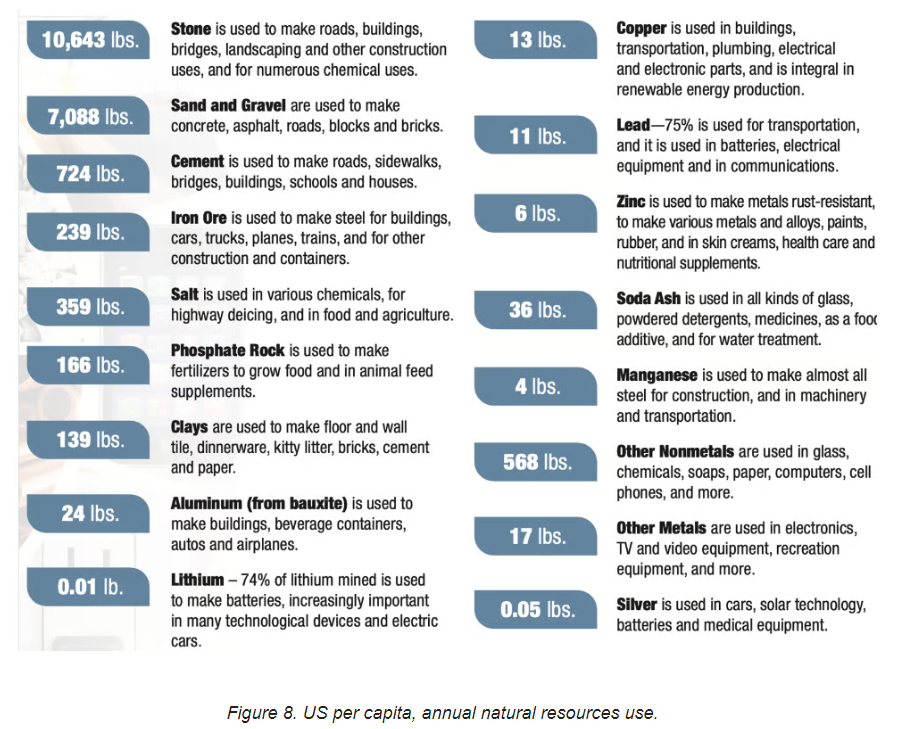 The demand for mined minerals is sometimes overlooked, but it is substantial. Natural resources and energy are the materials that drive the economy. The UN reports that natural resource materials consumption, unchanging since 2010, is 0.96 kg/$. Such mined resources include coal and petroleum for energy.