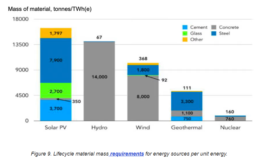 Seemingly wind and solar radiation from the Sun could generate electric energy without mining and consuming Earth’s natural energy resources. However, producing the capital goods involved in building such generators consumes ten times more natural resources than building nuclear power plants. The Figure 9 tally below does not even include the natural resources needed to build material-intensive storage batteries to mitigate intermittency, nor transmission lines to mitigate the dispersion of locations where solar and wind energy might be collected.