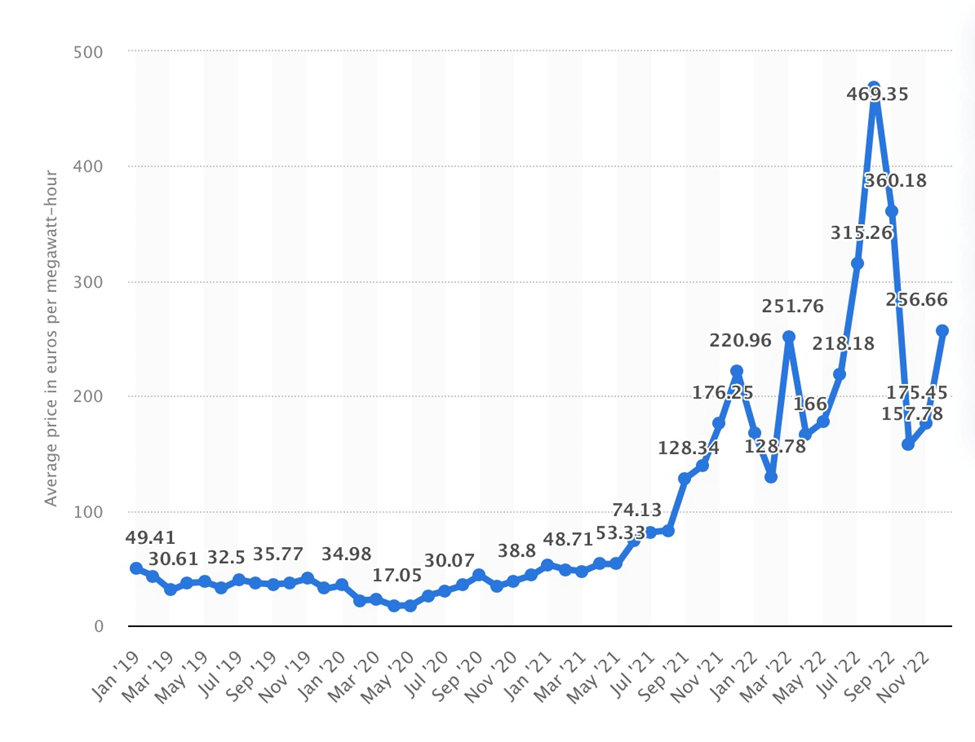 According to Statista, the average wholesale electricity price in Germany in December, 2022 was 256.66 euros per megawatt-hour, an increase of 16%, year on year. Four months earlier, German power prices hit a record-high 469 euros. Compared to January 2019, that is close to a 10-fold increase!