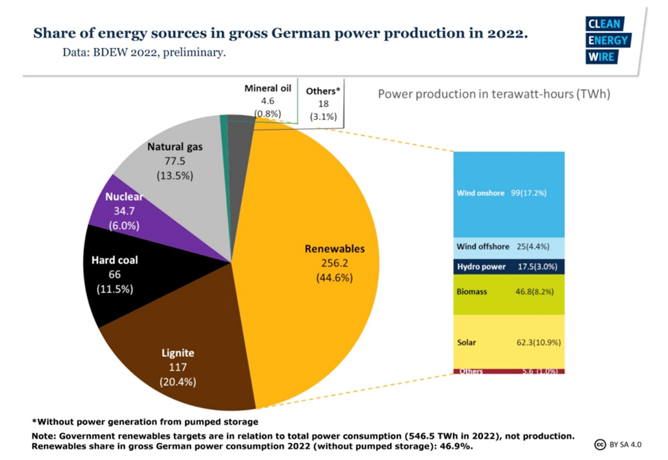 According to Clean Energy Wire, the country in 2022 got 44.6% of its power from renewables; 20.4% from lignite, a form of coal; 13.5% from natural gas, 6.0% from nuclear and 11.5% from hard coal.