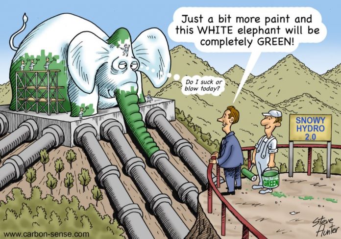 With a price tag in excess of $10 billion, Australia’s biggest pumped hydro project, Snowy 2.0, is easily its single biggest white elephant. Sure, the Feds have already squandered magnitudes more on subsidies and soft loans to wind and solar. And the purported benefit of Snowy 2.0 is to use excess wind and solar power to pump water uphill so that it might deliver electricity on demand – rather than at the whims of mother nature. But one form of wicked waste, hardly excuses another.