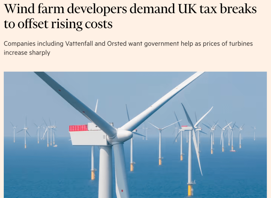 Confirmation that we were correct can be found in the fact that the Financial Times is now reporting that wind farm developers, including the industry giants Vattenfall and Ørsted, are asking for tax breaks in the forthcoming budget, offering the spurious justification that inflation has made uneconomic their low Contracts for Difference contracts awarded for delivery in 2024 (FT: “Wind Farm Developers demand UK tax Breaks to offset Rising Costs”).