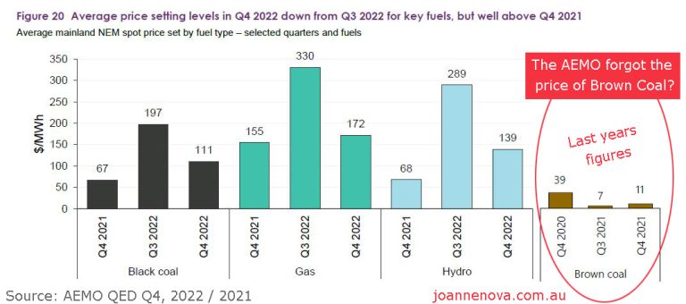 Many Australians face a 20 to 30% rise in their electricity bill this coming winter, so it seems odd that the AEMO* forgot to put the price of the cheapest source of electricity in their last quarterly report. The bid-setting prices for brown coal have been some of my favourite graphs, but this quarter, for the first time a whole energy source disappeared. It would only be another 2 digit number in a 69 page report, yet the average winning bid of brown coal generators on our national grid last quarter is not even mentioned?