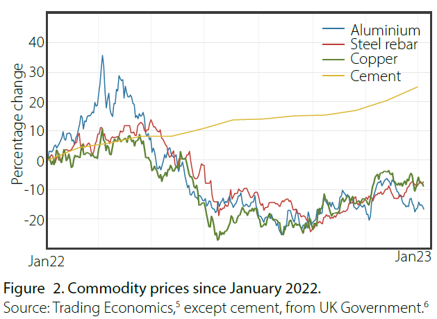 Claims that inflation has caused difficulties are also false, however. All new capacity will operate under the Contracts for Difference regime, which offers guaranteed, index-linked prices to generators. In addition, there is little sign that key commodities used in windfarm construction are at higher prices now than when CfD bids were submitted at the start of 2022 (Figure 2). In fact only cement has seen price rises since that time.