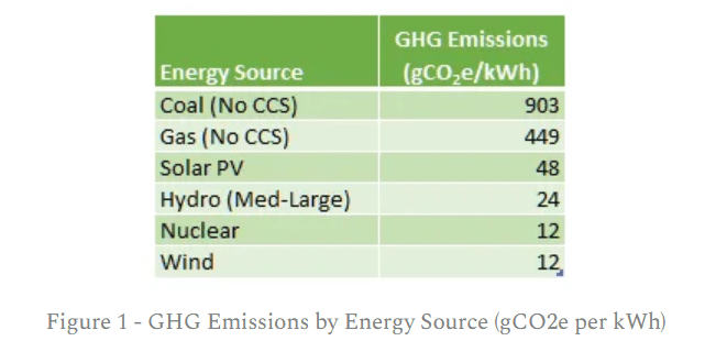 We begin with the metric most often used to determine how green a particular energy source is. Metrics vary, some look at just CO2, others look at other greenhouse gases (GHG) and of course methodologies vary. However, all methodologies show a broadly similar picture. For the purposes of this article, I have chosen the UNECE as a source (p73) and taken their median figures for representative technologies (see Figure1).