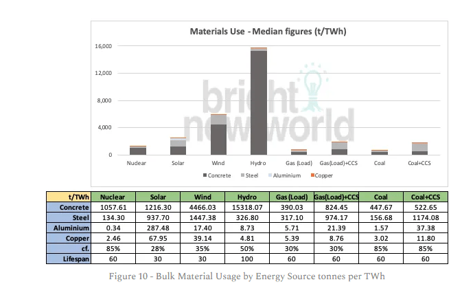 By this measure hydropower is an outlier because of all the concrete required to build the dams. However, wind and solar do not fare well compared to nuclear, coal or gas. Wind consumes 5,931 tonnes of bulk material per TWh and solar 2,441, many times higher than coal, gas or nuclear. The lifespan of 30 years assumed for wind and solar also probably flatters the actual real world performance, but the 60 year lifespan assumed for gas and coal are probably too high too.